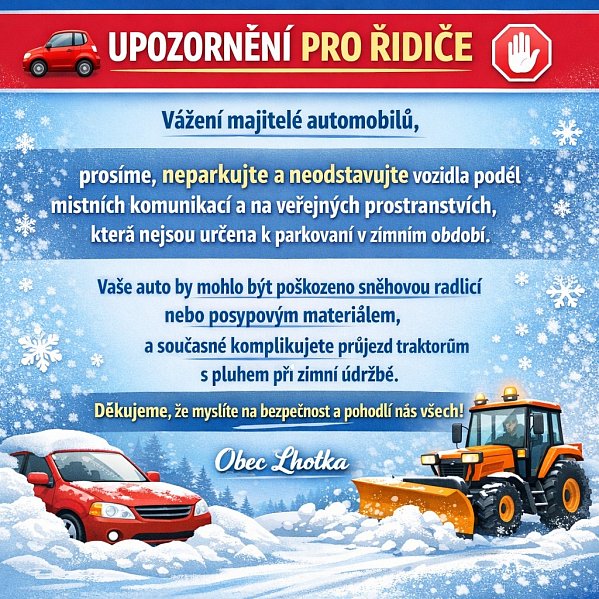 Upozorňujeme majitelé automobilů, aby v zimním období neparkovali a neodstavovali vozidla podél místních komunikací a na veřejných prostranstvích, která nejsou určena k parkování z důvodu zimní údržby a odhrnování sněhu. Během této činnosti může dojít k poškození vašich vozidel sněhovou radlicí, nebo odlétajícím posypovým materiálem. Uvědomte si, že tam, kde ještě projede osobní vozidlo, už se nemusí traktor s radlicí protáhnout, a ještě hrne nějaké množství sněhu, který je potřeba taky někde uložit. Neztěžujte již tak namáhavou a zodpovědnou práci pracovníkům provádějícím zimní údržbu.