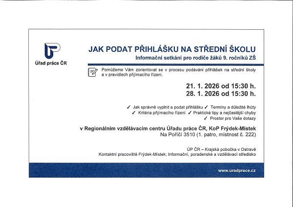 Rádi bychom Vás informovali o akci, kterou připravilo Informační, poradenské a vzdělávací středisko Úřadu práce ve Frýdku-Místku pro rodiče žáků 9. ročníků ZŠ.